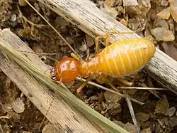 Солдаты. Голова большая, обычно короткая и широкая, иногда удлинённая; по бокам прямая, параллельная, или сходится к передней части; цвет головы жёлто-коричневый; волосистость головы переменная, от нескольких рассеянных до множества волосков, коротких и длинных. Фонтанелла короткая. Усики 19—21-члениковые. Лабрум трёхконечный с белой областью на срединной доле (лабральная железа неизвестной функции, вероятно, оборонительная). Жвалы большие и массивные, различной формы и зубчатости; левая мандибула с маргинальным зубцом (M1) обычно около середины, иногда ближе к основанию; второй маргинальный зубец (M2) маленький и расположен около основания; правая мандибула также с двумя маргинальными зубцами, они обычно менее развиты, чем на левой мандибуле, иногда рудиментарные или отсутствуют. Пронотум с крупной возвышающейся передней долей. Боковые края груди не угловатые, обычно без выступов, иногда с острыми или коническими шипами. Ноги обычно длинные; передние голени с многочисленными короткими щетинками на внутреннем крае[1].