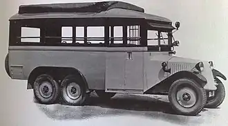 Двигатель позволял развивать автомобилю массой 1350 кг скорость до 60-70 км/ч. Шасси представляло собой передний мост с поперечной листовой рессорой и распашные оси в центре и сзади со стреловидными продольными рессорами. Колёсная база составляла у первых образцов 2200 мм, у более поздних — 2900 мм (ширина 1300 м). Более короткая колёсная база повышала проходимость автомобиля.