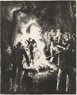 Американский историк-искусствовед Дора Апель отметила пустое пространство между наблюдающими людьми на переднем плане картины, способом Беллоуза сделать зрителя причастным к происходящему, поставив его в роль невольного свидетеля казни. Также Апель, основываясь на кровотечении между ног горящего человека, озвучила мнение о его предполагаемой кастрации, произведённой линчевателями за некоторое время до момента запечатлённого на рисунке[4].