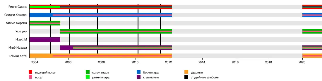 ![]() Группа в 2012 году: (слева направо) Укигумо, Тосики Хата, Ринго Сиина, Сэидзи Камэда и Итиё Идзава. | |