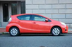 В декабре 2011 года в Японии был представлен компактный хетчбэк Aqua с самым низким, на тот момент, расходом топлива в мире[46]. Весной следующего года этот автомобиль под названием Prius c (city — городской) стали продавать в Северной Америке[47]. Автомобиль был на полметра короче базовой модели Prius, оборудовался 1,5-литровым бензиновым двигателем и имел, размещённую под задним сиденьем компактную аккумуляторную батарею.