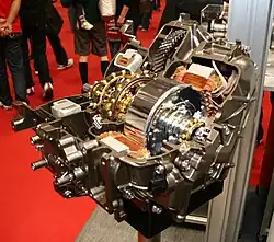 Второй комплект шестерён понижал обороты электромотора, позволяя использовать более эффективный высокооборотный (13 000 об/мин) синхронный электродвигатель переменного тока, который работал на повышенном до 650 вольт напряжении. Всё это в целом увеличивало его отдачу на 20 %[33]. Синхронный генератор переменного тока, помимо выработки электроэнергии для зарядки батареи, использовался для управления работой трансмиссии и вместо стартера, для запуска двигателя[34].