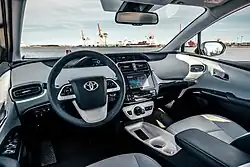 В салоне, несмотря на его футуристический вид, всё направлено на создание максимального удобства. Передняя панель аккуратно окружает водителя и даже заходит на двери, а расположенный под ветровым стеклом многофункциональный дисплей отображают всю необходимую информацию. Доминирующая центральная консоль выполнена в «летящем» стиле, 6-, 7-[14][15] или 9-дюймовый[16] сенсорный экран в центре её позволяет интуитивно управлять музыкой и навигацией. Только в Японии вместо экрана можно заказать аудиосистему с радио, CD-проигрывателем и USB-входом[17]. С 2017 года на модели в дорогих комплектациях для Японии[18] и Северной Америки[19] на передней панели устанавливается вертикально расположенный 11,6-дюймовый планшет такой же, как у Prius PHV.