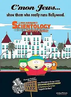 Паркер и Стоун изображены, рисующими граффити на знаке Церкви саентологии в Лос-Анджелесе