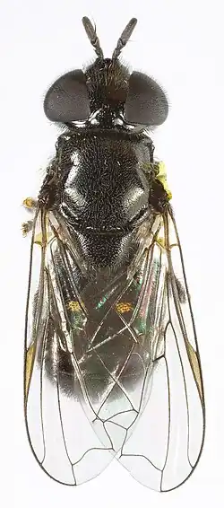 Мелкие чёрные мухи длиной тела 5-8 мм[1]. Передняя часть мезоплевра в длинных торчащих волосках. Второй тергит брюшка с жёлтыми пятнами[2].