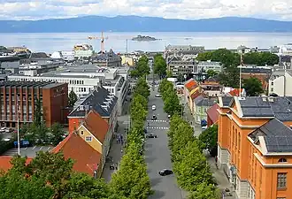 Вид на улицу Munkegata в историческом центре Тронхейма и остров Мункхолмен с крыши Нидаросского собора