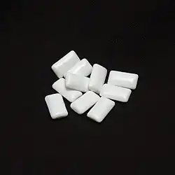 Резинка также содержит вкусовые добавки, ароматизаторы, консерванты и другие пищевые добавки. В последнее время стали популярны резинки, содержащие сахарозаменители и противокариозные вещества, например, соединения фтора, ксилит, мочевина (карбамид). Однако остановить или вылечить уже имеющийся кариес эти вещества, как и в случае с зубной пастой, не могут[9][10].