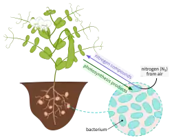 Микроорганизмы различаются по типу взаимоотношений с растением, например, встречаются патогены, эндофиты и симбионты[23]. Потребности растений в азоте, фосфоре и железе удовлетворяются за счёт активности микроорганизмов в почве, на её поверхности и в непосредственной близости от неё[24]. В свою очередь, источником углерода для представителей растительного микробиома могут служить как исключительно корневые экссудаты растений (например, род Myxococcus), так и органическое вещество почвы (например, отряд Sphingomonadales)[25]. Почвенные микроорганизмы колонизируют корни растений. Комменсальные, симбиотические или патогенные бактерии и грибы надземных частей растений, также частично происходят из корней и почвы. На формирование микробного сообщества в ризосфере оказывают влияние генотип растения-хозяина, тип почвы и методы выращивания[26], изменяют фенологию и время цветения[27], влияют на выработку сухого вещества побегов растений[28] и вызывают системную устойчивость к болезням[29]. Также вероятно, что микробиомы влияют на качество смол, фруктов, мёда и эфирных масел[30].
