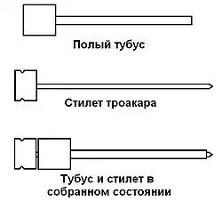 - Тубус (трубка, гильза, канюля) — полая трубка, в которую вставляют стилет перед проколом. В последующем она остается в толще тканей, соединяя полость тела с окружающим пространством, то есть формируется своеобразный рабочий канал, через который вводят инструменты или извлекают удаленные органы и ткани.